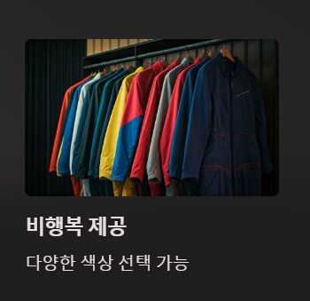 - 비행복 제공: 다양한 색상의 비행복이 준비되어 있어 원하는 스타일로 체험이 가능합니다.