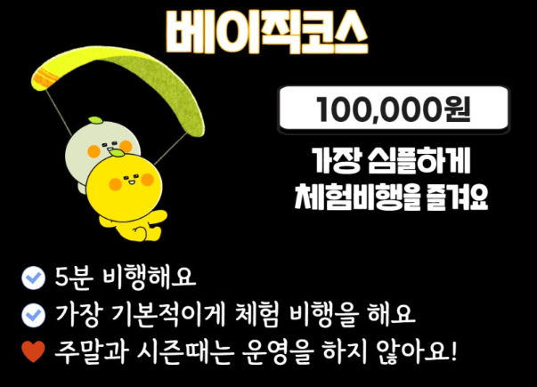 - 다이나믹 코스 (15만원): 기본 체험에 더해 하늘에서 짜릿한 회전 등 다이나믹한 비행을 즐길 수 있어 스릴을 원하는 분들에게 인기가 많습니다.